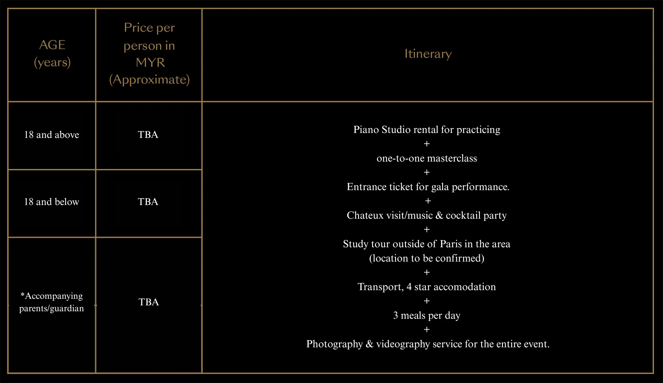 Piano Studio rental for practicing + Entrance ticket for gala performance. + Chateux visit/music & cocktail party + one-to-one masterclass + Study tour outside of Paris in the Normandy area (location to be confirmed) + Transport, 4 star accomodation + 3 meals per day + Photography & videography service for the entire event.